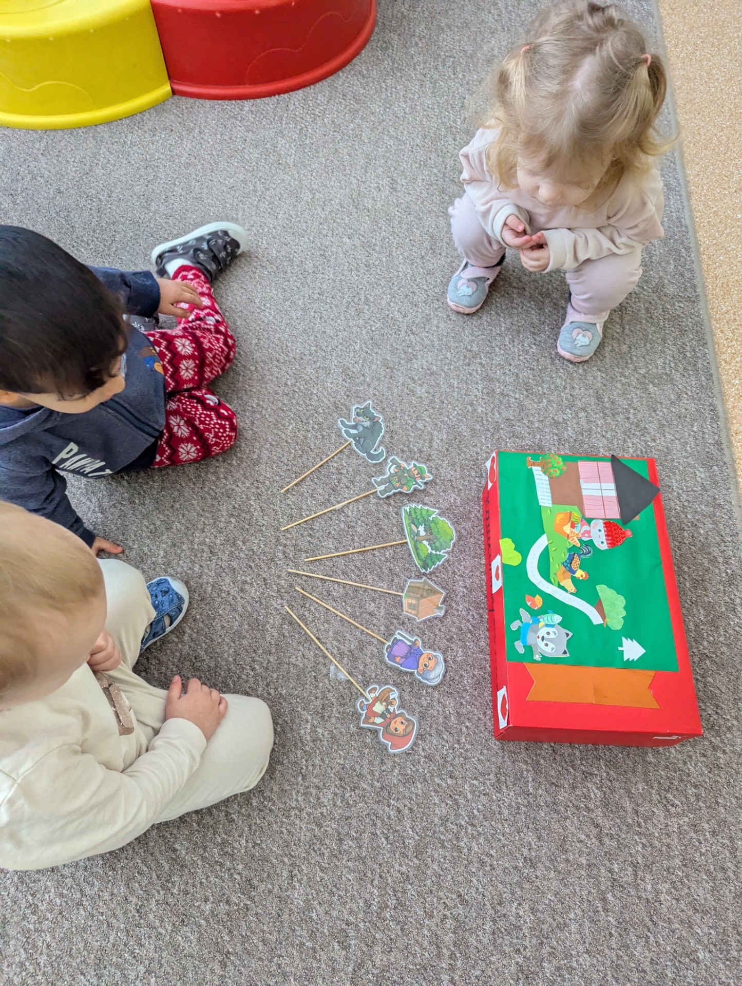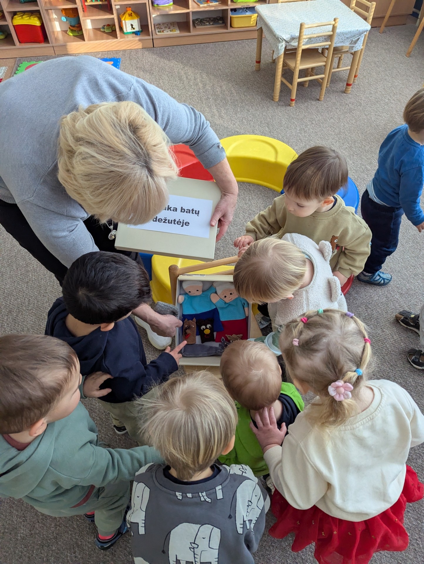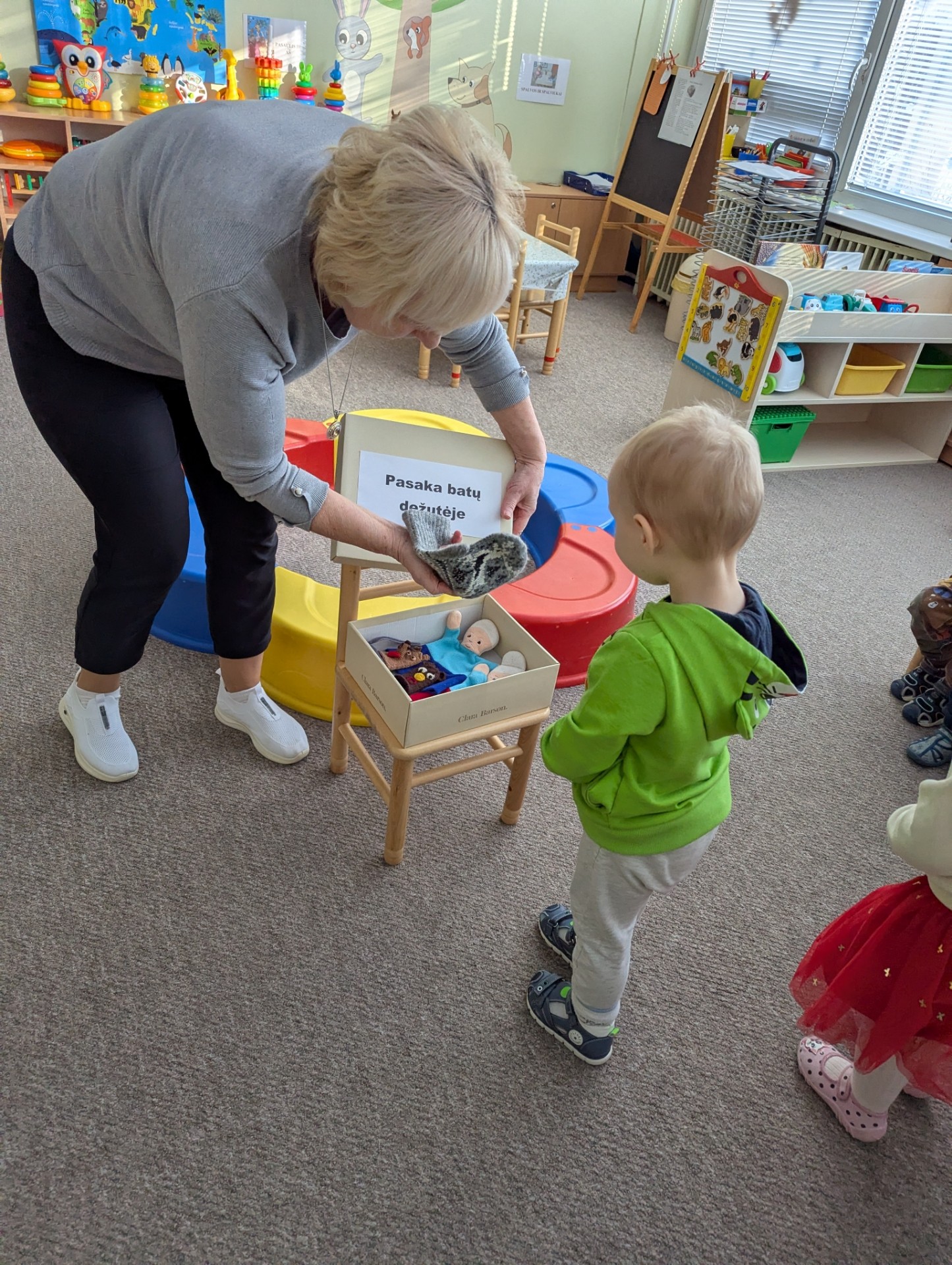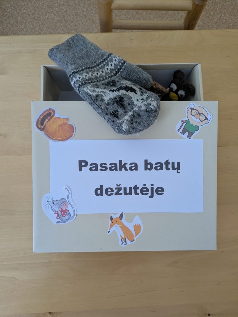 Vaikai klausėsi keturių batų dėžutėse „apsigyvenusių“ pasakų: „Skruzdėliukas Nežiniukas“, „Raudonkepuraitė“, „Ropė“ ir „Pirštinė“. Grupės tarpusavyje keitėsi pasakomis, todėl visi vaikai turėjo galimybę išgirsti ir pamatyti skirtingas pasakas. Mažieji ne tik klausėsi, bet ir aktyviai dalyvavo vaidinimuose – įsitraukė judesiais, garsais, emocijomis, bandė atkartoti veikėjų veiksmus. Parinkti muzikiniai intarpai padėjo vaikams išlaikyti dėmesį, atsipalaiduoti ir lengviau sekti pasakos eigą. Muzika kūrė jaukią, įtraukiančią atmosferą ir stiprino emocinį poveikį.