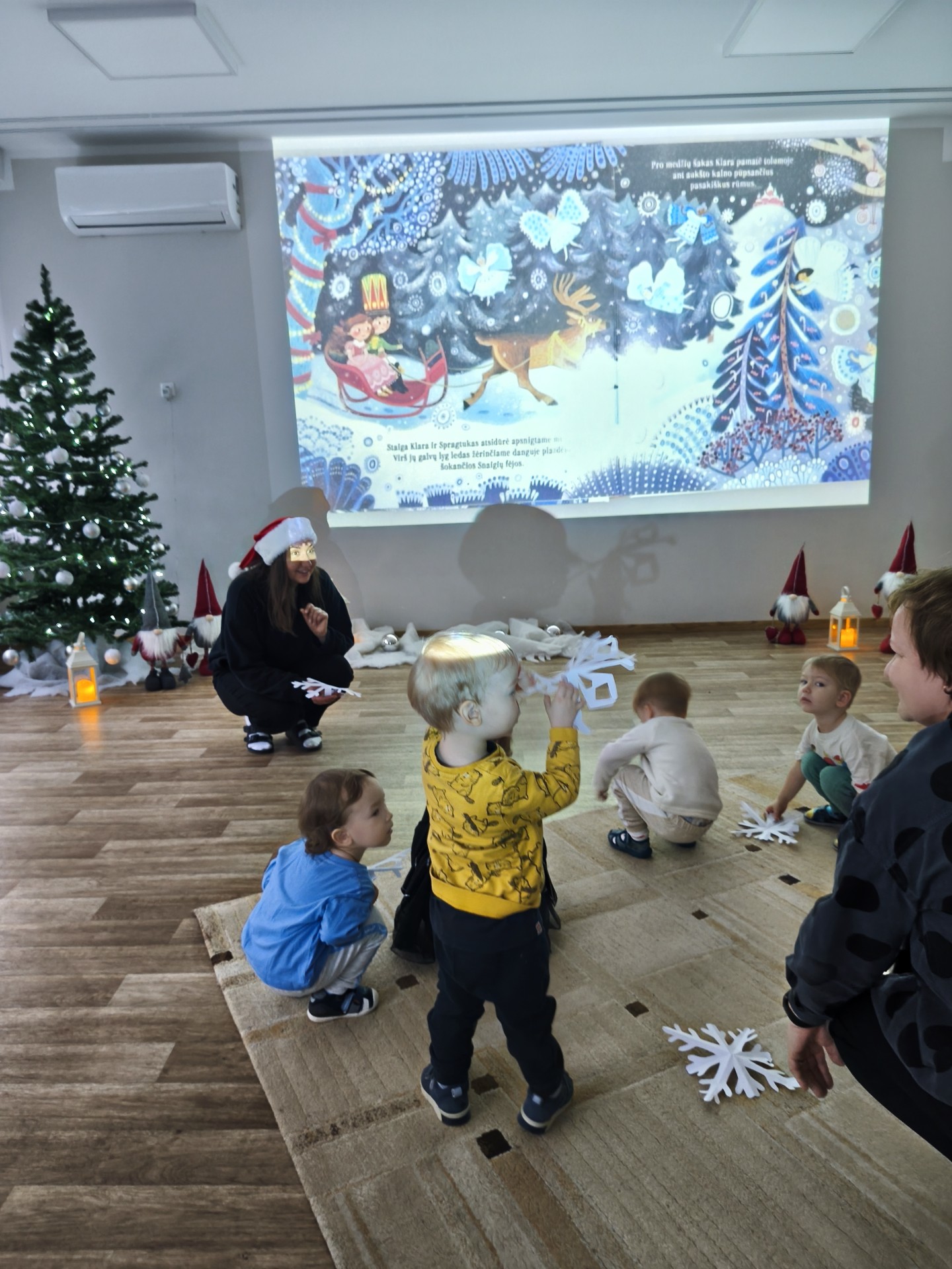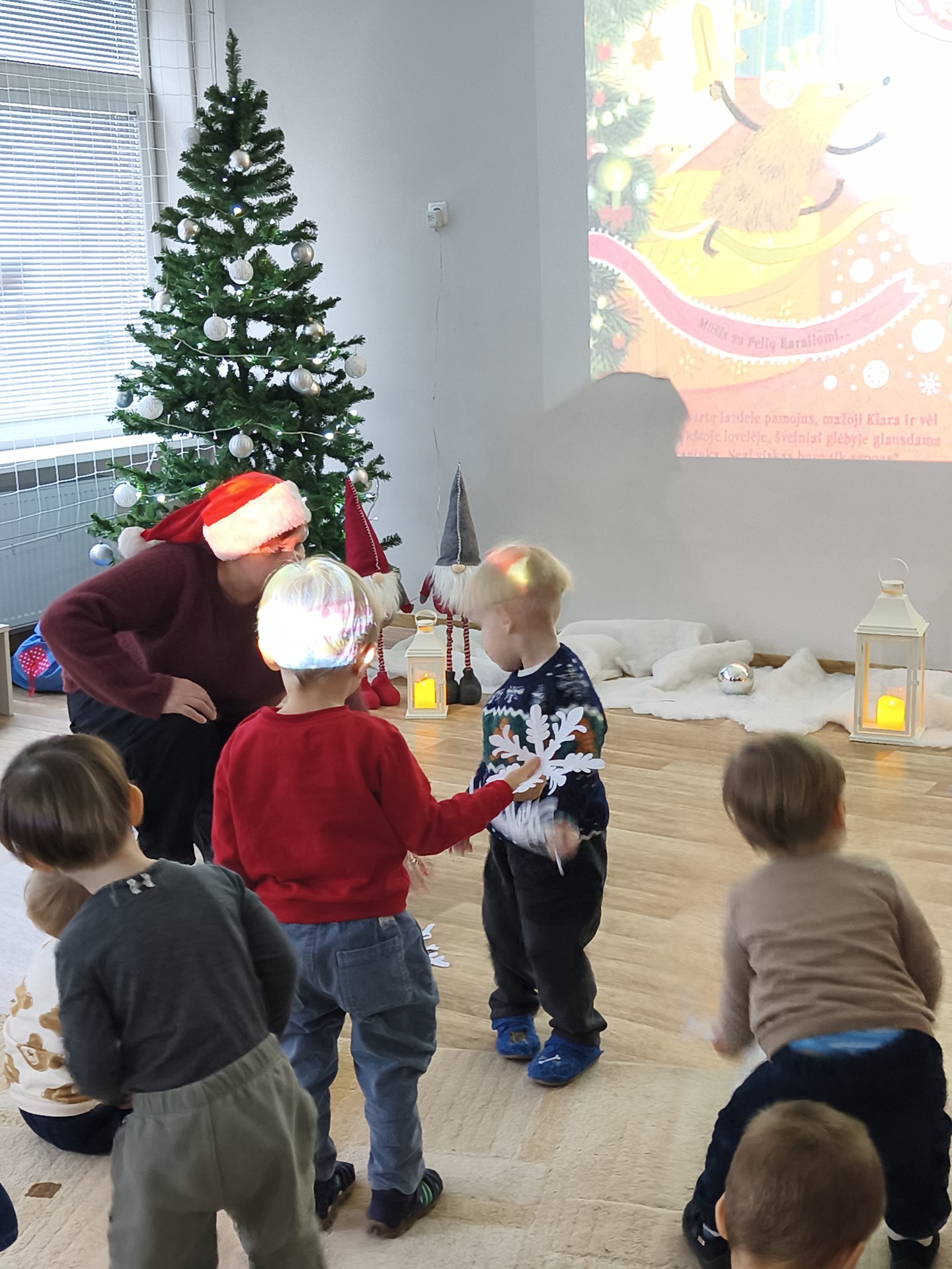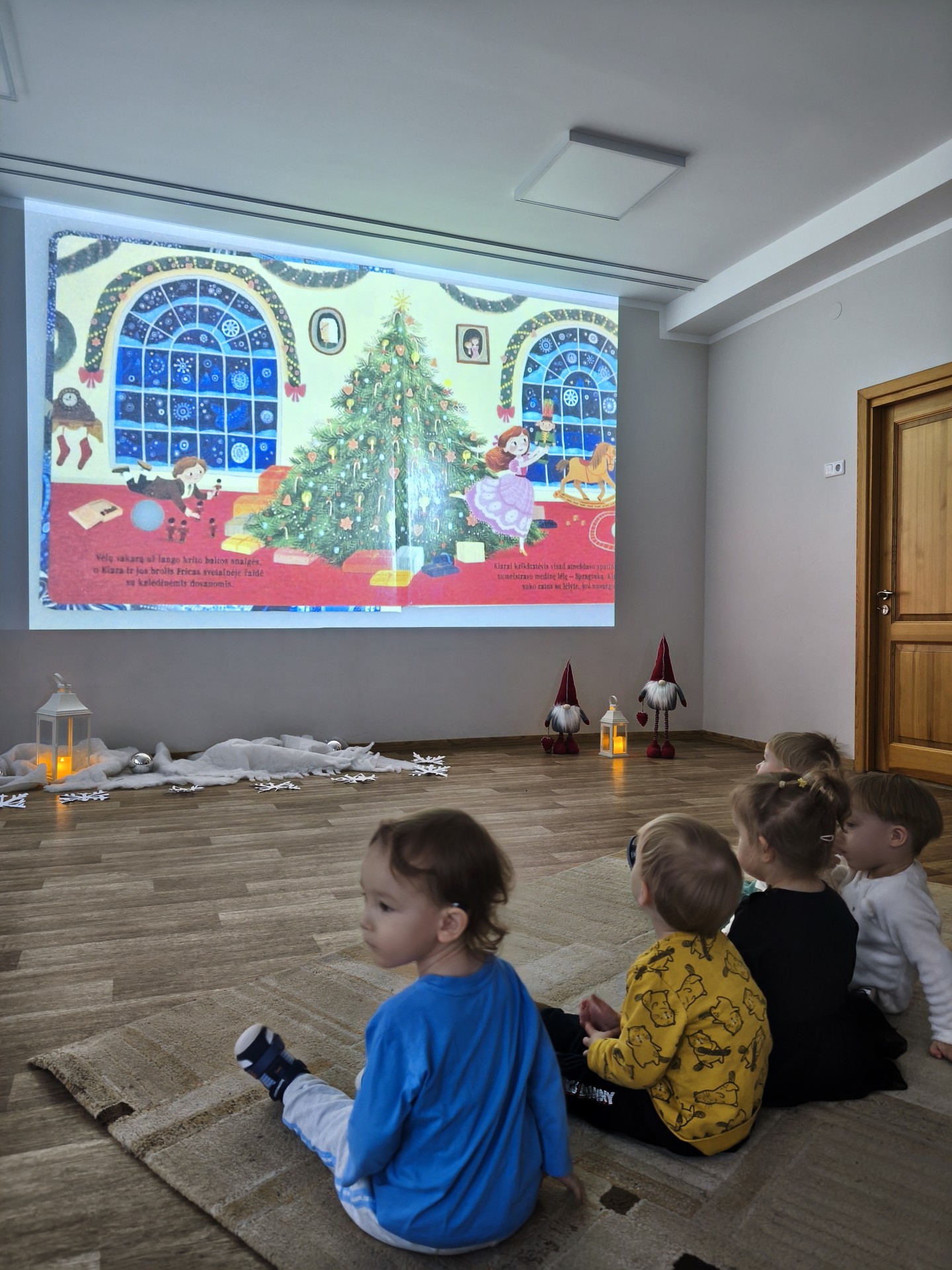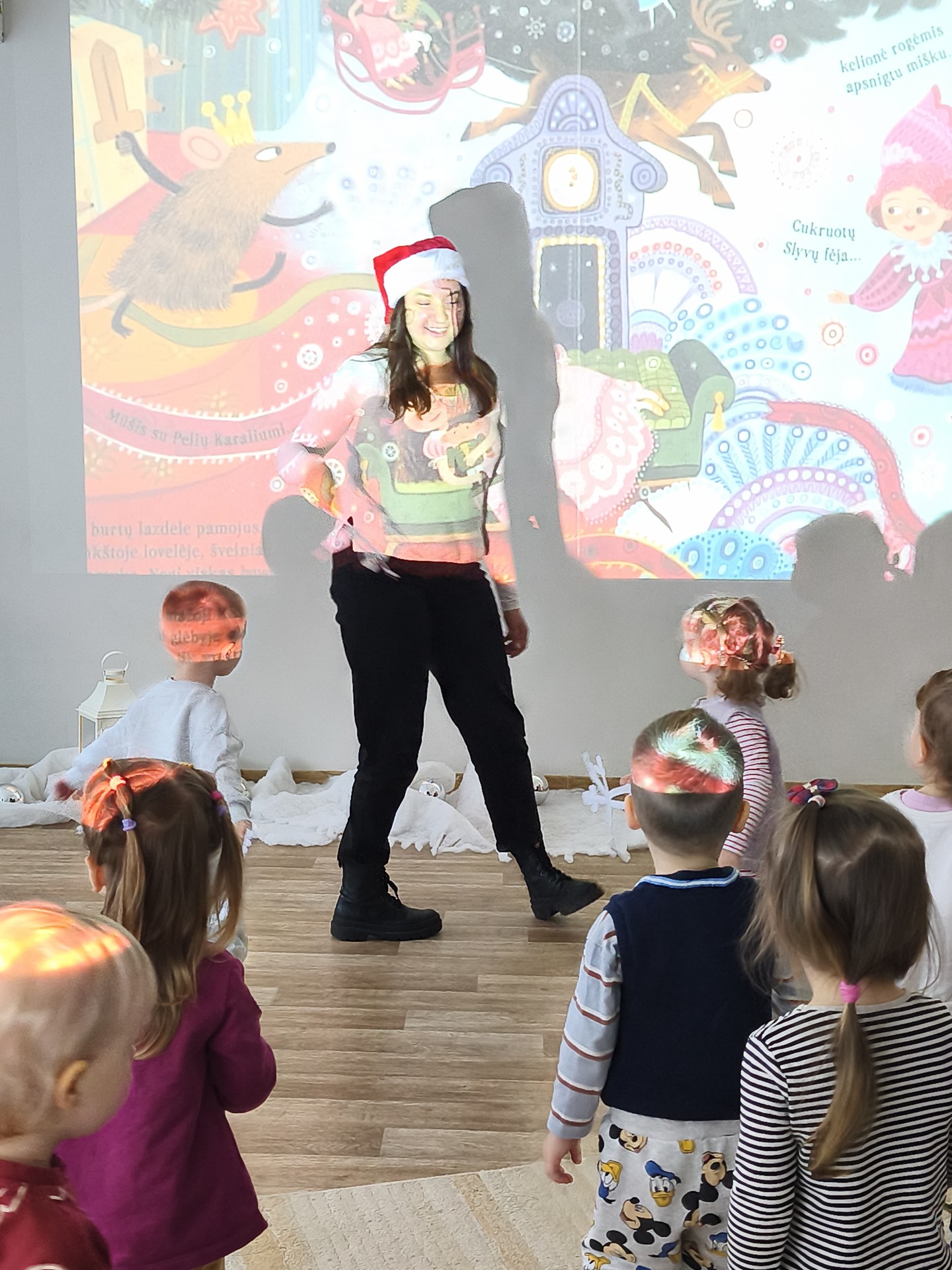 .Jaukioje, ramioje aplinkoje vaikai klausėsi žiemos pasakų, stebėjo vaizdus, klausėsi garsų, žaidė su šešėliais bei įsitraukė į vaizduotės pasaulį tiek judesiais ir tiek emocijomis. Skaitymai tapo ne tik pasakojimų klausymu, bet ir mažomis patirtimis – apie stebuklą, laukimą, šilumą ir buvimą kartu.